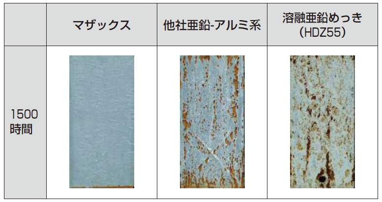溶融亜鉛めっき(HDZ55)と他社亜鉛- アルミ系塗料およびマザックス®で膜厚50μmにて塩水噴霧と複合サイクル試験を行った結果、クロスカット部に錆も発生せず結果は良好であった。