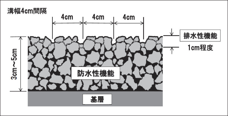 締固装置を改良したフィニッシャを用いた施工によって、路面のキメ深さを確保できる縦溝粗面に仕上がり、この縦溝粗面と表面付近の空隙層に凍結防止剤が簡単に流出せずに留まることで、塩分残存率の高い粗面系の凍結抑制舗装となる。