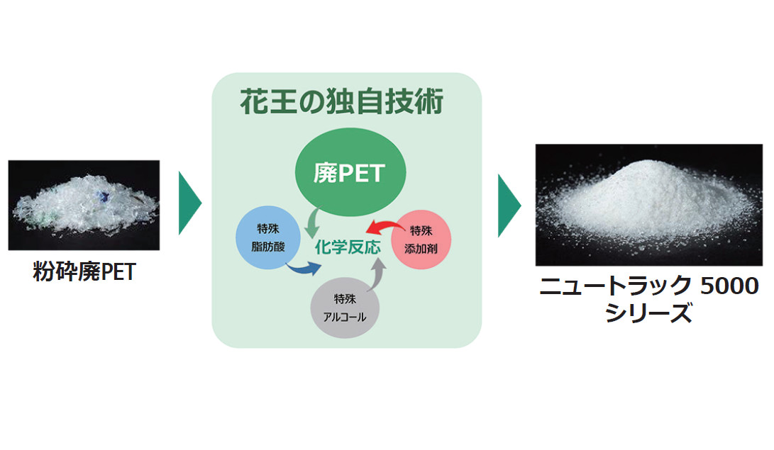「ニュートラック 5000 シリーズ」は、廃棄されるPET素材(廃PET)を原料として同社が独自の処理を加えたアスファルト改質剤である。