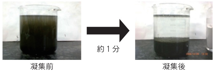 3.無機系凝集剤を使用(カルシウムが主成分の無害・中性の粉末で、高い凝集力および凝集速度を持つ)。