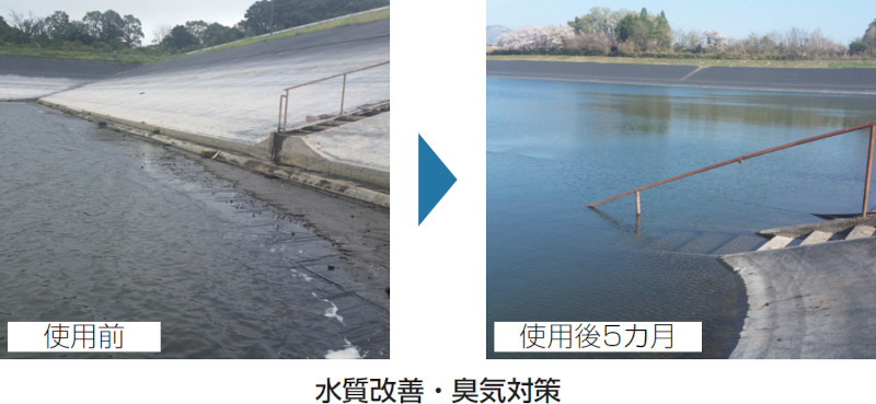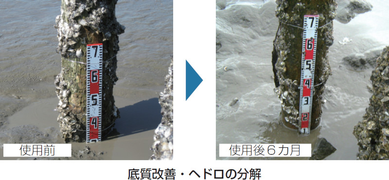 「アクアリフト」は、微粒子状のモンモリロナイトに硫黄細菌を組み込ませた微生物資材で、ダム・湖沼・河川・堀・溜め池・海湾・養殖場などの底泥・硫化物・水質・臭気を分解改善することができる。