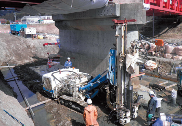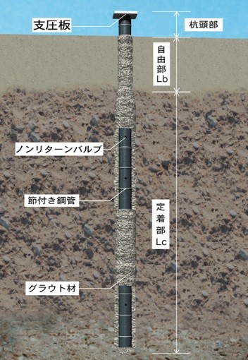 本工法は、セメントグラウトを加圧注入し、節突起を設け付着性能を向上させた高張力鋼管と合成させる小口径場所打ち杭である。