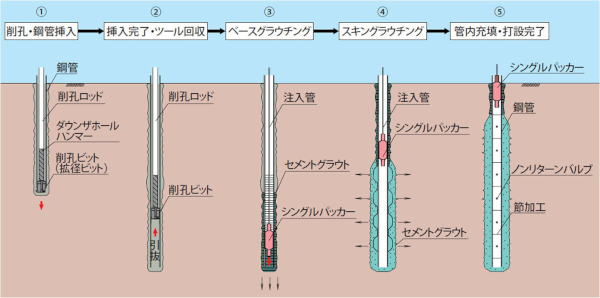 グラウト注入は、グラウトパッカー装置を用いた加圧注入方式であり、削孔壁部および地山への確実なグラウト注入が可能で、カプラーを用いた機械式ねじ継手により、現場溶接杭に比べて施工性および杭耐力が向上している。