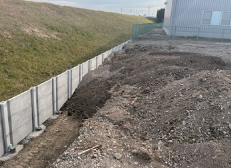 現場打ち小型擁壁(フェンス柱箱抜き)から、コンクリート柱と土圧板を組み合わせて設置するプレキャスト製のフェンス用基礎に変えた。