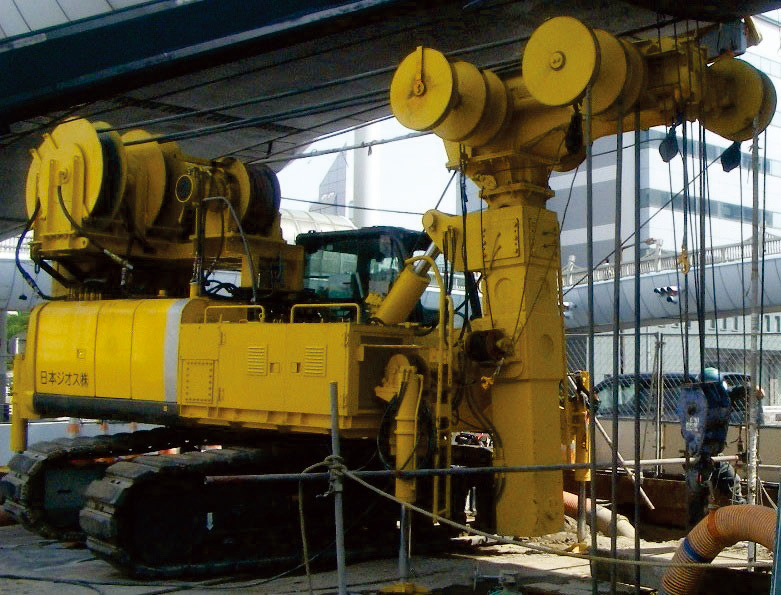 ドリル本体を直角にセットし、縦掘が可能なため、作業帯巾が5m程度の狭隘部でも施工することができる。