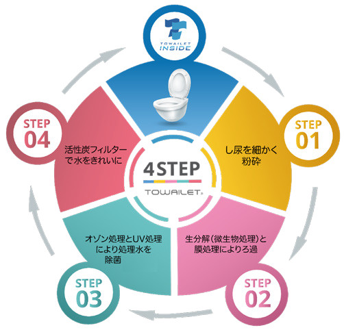TOWAILET(トワイレ)は、浄化処理技術と再生可能エネルギー蓄電システムを搭載し、ライフラインが寸断された場所でも、置くだけで使える「自己処理型水洗トイレ」である。