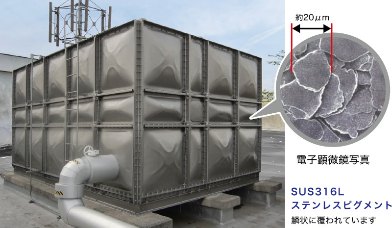 ステンレスピグメント(SUS316L)を配合し、空気、光、湿分を遮断し、加水分解を防ぐことにより、母材の劣化を食い止めることができる貯水槽延命工法である。