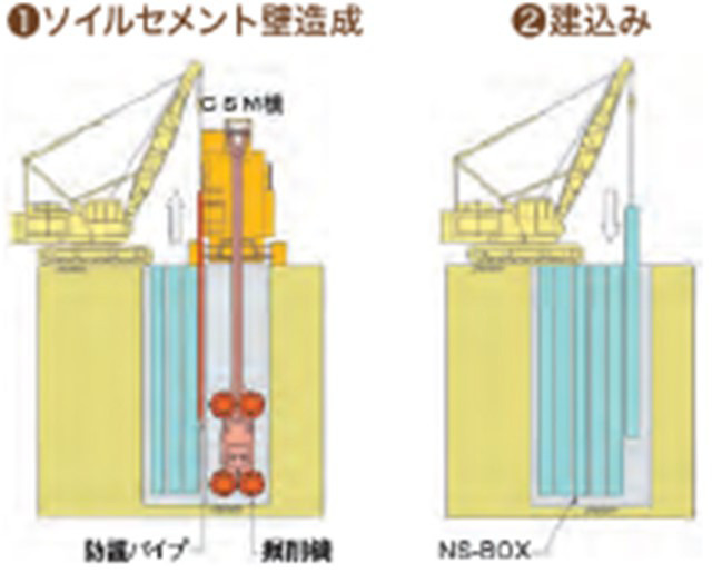 原位置土混合撹拌工法などにより、ソイルセメント壁を造成後、NS-BOXを相互に連結しながら建て込み、壁体を構築する。