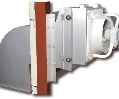 物流センターや工場などの換気用として、外壁には有圧換気扇が設置される。その開口部をカバーするために、取り付けられるのがウェザーカバーである。給気用のウェザーカバーは強い雨の際、雨水を給気と一緒に吸い込んでしまうため、雨水が屋内へ浸入し、設備に影響を与えるリスクがある。