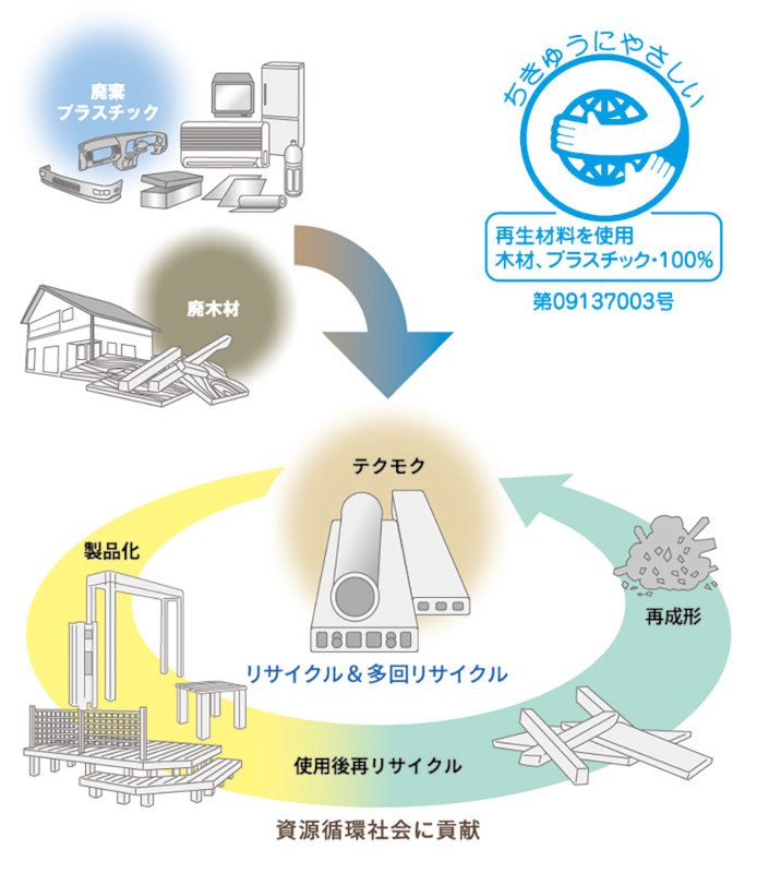 「テクモク」は、建築解体現場や工場などから排出される廃木材と、廃棄処分となったプラスチックを原材料とした100%リサイクル素材。