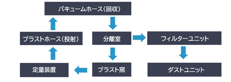 一般の加圧式のブラストタンクでは、いったん機械を止めてエアーを抜く作業が必要であるが、ツーノズルハンドブラストマシンは構造が3部屋に分かれており、上室にバケットバルブを使用することでエアーの密閉が容易になり、上室のバケットバルブが左右交互に動き加圧状態を保つため、連続運転が可能である。