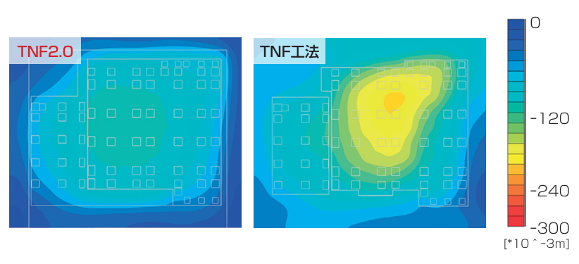 TNF工法は、井桁形状に造った改良層に基礎、スラブコンクリートを直接打設する特殊基礎工法で、改良層と基礎、スラブが一体化するため、効率的に建物荷重を地盤に伝えることができる。