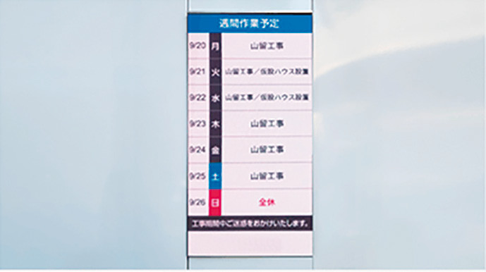 フリーレイアウトで簡単にコンテンツを作成できる現場向けのサイネージシステムを利用し、配置図や注意事項、天気・熱中症などの現場に役立つさまざまな情報を配信可能。