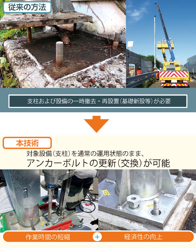 一般的な基礎の交換作業、および支柱等の撤去・復旧・移設作業が不要であり、簡素に施工できる。
