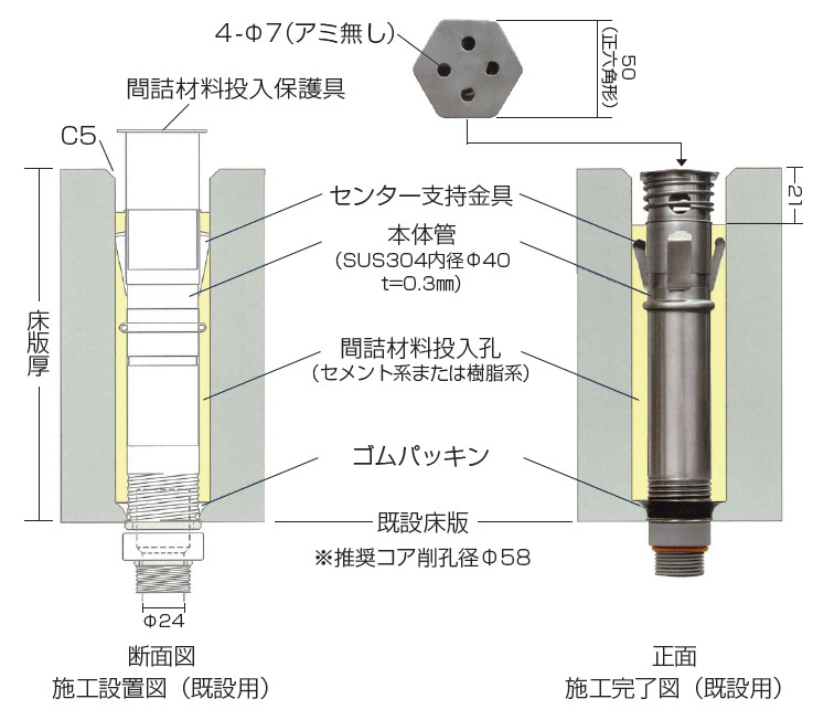 「床版自在排水管」は、橋梁用床版の水抜きパイプをステンレス製および一部蛇腹加工した技術で、従来は亜鉛メッキ製水抜きパイプを用いていた。