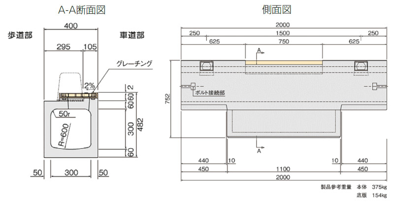・歩車道境界ブロックと水路を組み合わせたプレキャスト製品である。