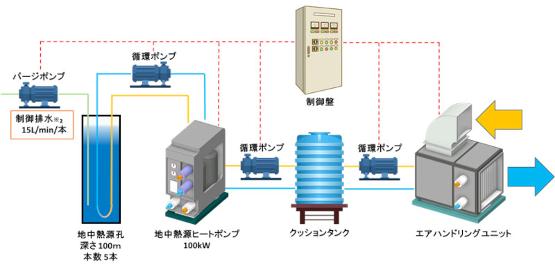 このシステムは、再生可能エネルギーである地中熱を冷暖房や給湯に利用することで、従来の空調システムよりもエネルギー消費を抑え、温室効果ガス(CO2)の排出削減に貢献する。