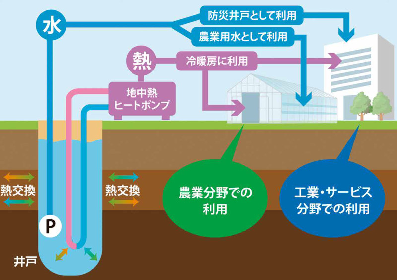 同システムには、井戸内の水と採熱管の熱交換を行う独自の地中熱交換技術「ヒートクラスター®」を採用し、従来の地中熱工法の4~5倍の性能を発揮することができる。