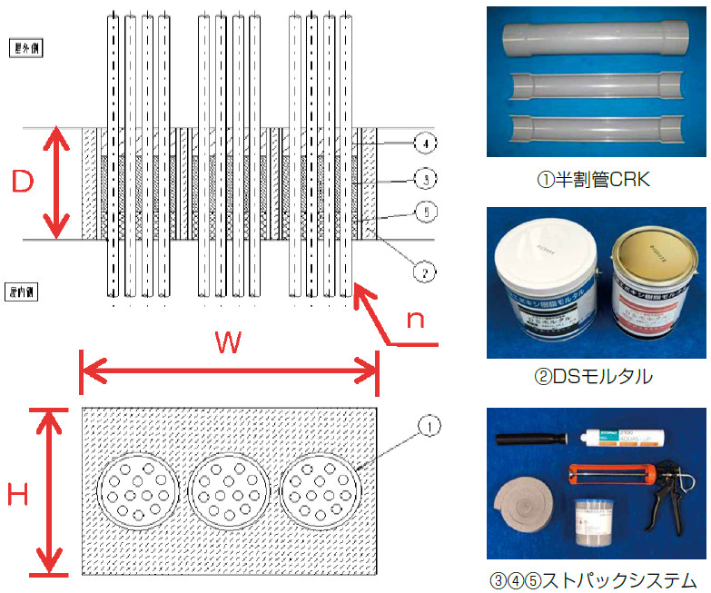 従来の止水材料では処理しきれなかった建物のピット、ダクトなどの壁貫通開口部を耐水化する工法。