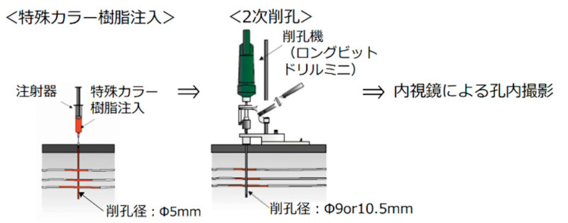 ①調査箇所選定などの準備→②鉄筋位置の確認→③一次削孔(削孔径:φ5㎜)→④特殊カラー樹脂注入→⑤二次削孔(削孔径:φ9または10.5㎜)→⑥内視鏡による孔内調査→⑦削孔部の充填補修→⑧柱状図の作製