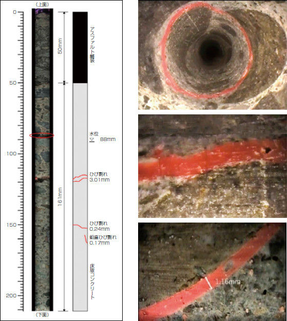 極小口径で削孔した床版コンクリートの孔内に特殊カラー樹脂を注入、高性能内視鏡を用いてステレオ撮影し、床版内部の直視方向と側視方向の画像と、専用ソフトを用いて作成した床版内部の柱状図を報告書に取りまとめることができる。