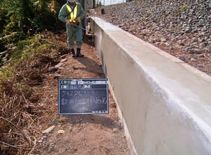 農業土木分野では農業用水路の長寿命化、劣化防止、維持管理の他、調整池内面に打設された床・壁コンクリートや各種擁壁、壁高欄の表面保護などで大きな効果が期待できる。