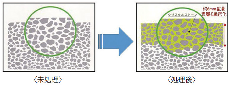 「クリスタルストーンNR」は、コンクリート、モルタル、スレートなどに表面塗布すると、多孔質基材が硬化する時に水和反応で発生する毛細管空隙内に深く浸透し、イオン置換反応によって不溶性結晶体を形成、基材の孔を充填、改質する。