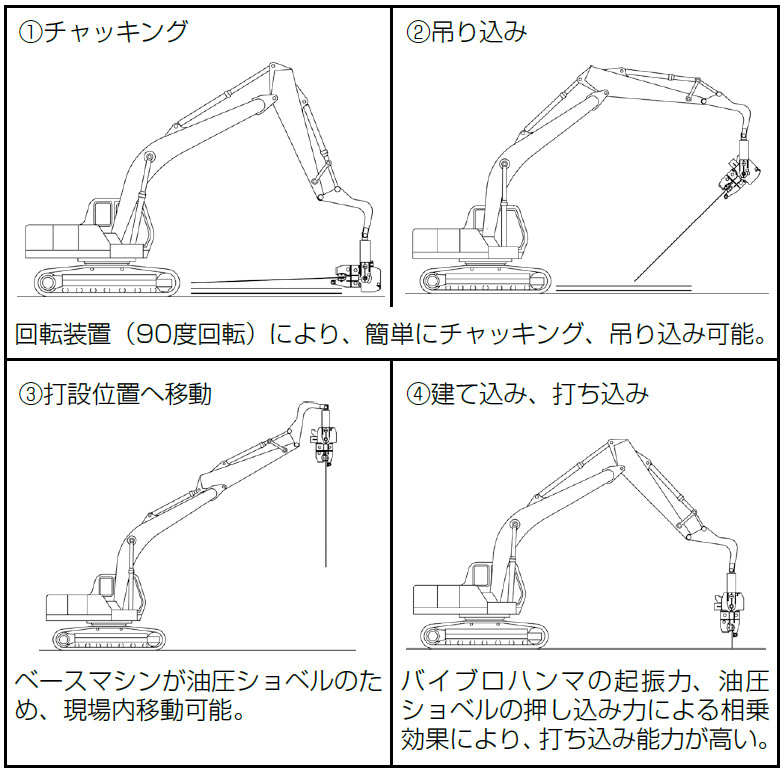 主に軽量鋼矢板や比較的軽量な鋼矢板、H形鋼杭の打ち込みおよび引き抜き施工に使用される。