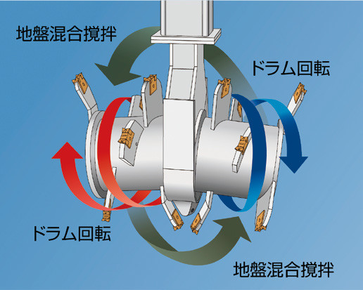 高油圧モーターを内蔵した撹拌装置を左右相対に回転させ、原地盤とスラリー化した改良材とを撹拌混合して、軟弱地盤を化学的に固化処理する中層混合処理工法である。