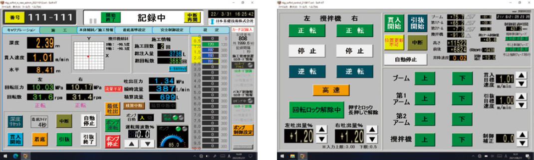 施工管理システムは、施工管理条件(深度、貫入・引抜速度、水平距離、流量、回転速度、攪拌装置傾斜角度)を設定し、リアルタイムに管理・制御・監視することが可能。