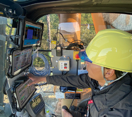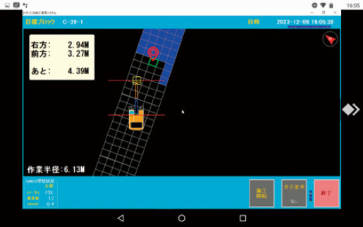 ICT施工時には、制御装置に位置誘導システムを搭載し、GNSSを用いて、施工位置の確認ができ、位置出し(明示・マーキング)の省略化が可能。