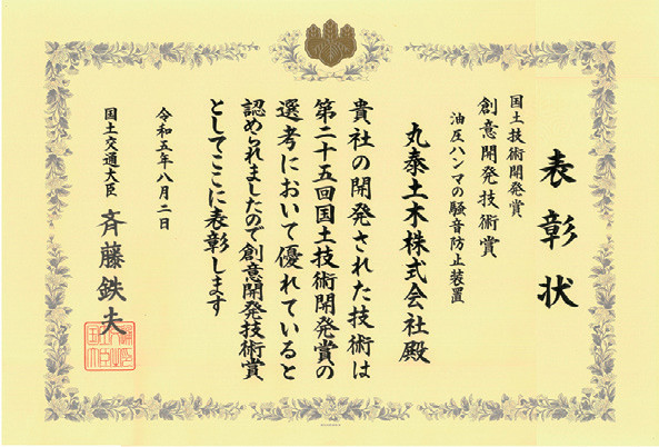 ・国土交通大臣「国土技術開発賞 創意開発技術賞」受賞(2023年8月)