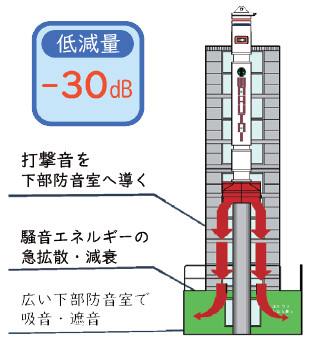 急拡大する下部防音室で音を減衰させ、内部の吸音材(軟質ウレタンフォーム)と鋼板製の遮音材で効果的に低減する。