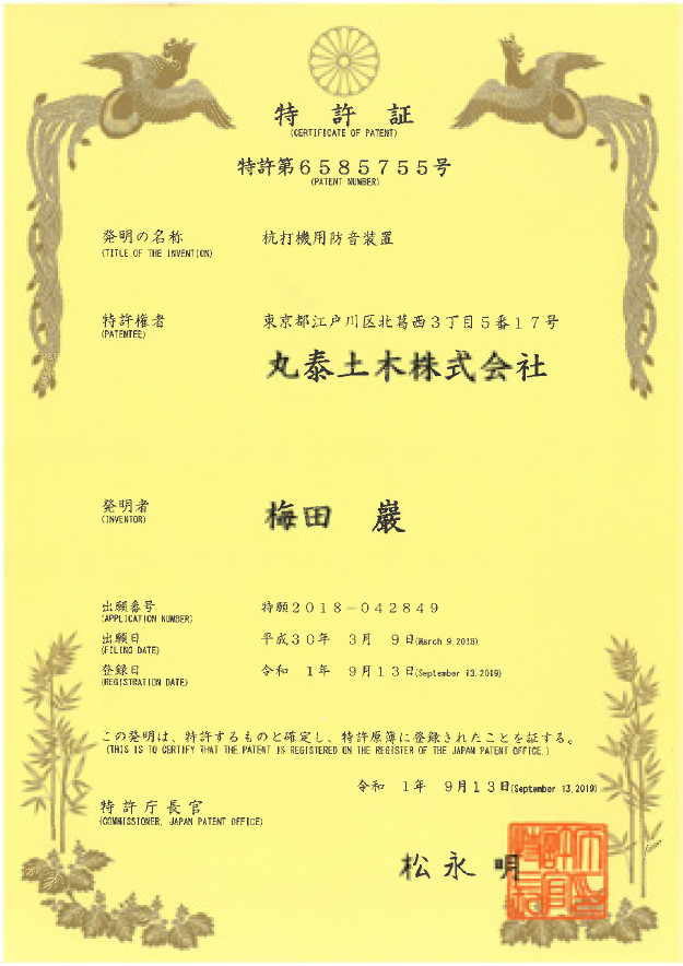 ・特許庁 特許第6585755号「杭打機用防音装置」取得(2019年9月)