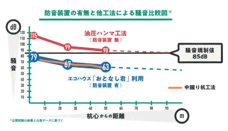 丸泰土木が開発した騒音防止装置エコハウス「おとなし君」Ⓡは、打撃音の低減に効果が確認され、市街地でも制約を受けずに打撃工法による打ち止めを可能にしている。