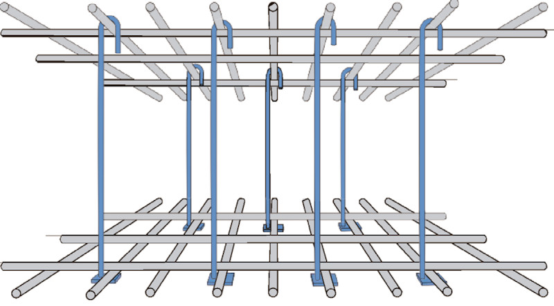 ところが、このようなせん断補強鉄筋を配筋するには、主筋と配力筋、さらにせん断補強鉄筋を複雑な順序で組み立てる必要があり、施工能率が低下するばかりか、機械式継手を必要とする場合もあり、コストアップが重大な問題となる。