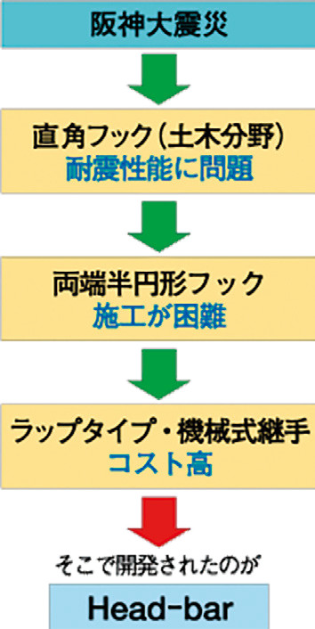 阪神大震災の教訓から構造物の耐震性能を高めるために、土木分野では従来の直角フックに代わって両端に鋭角または半円形フックを持つせん断補強鉄筋を使用することが標準となった。
