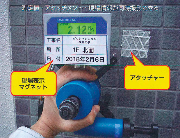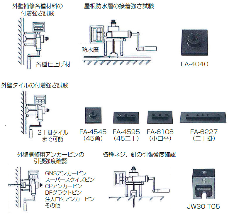 外壁タイルの付着力・接着力やアンカーピン・ネジの引張強度、外壁仕上げ材の劣化調査や施工品質の確認等に対応する簡易型引張試験器。