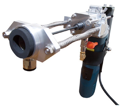 外壁タイルの補修や石材のピンニング固定工事に対応するタイル穿孔専用の水循環式無振動ドリル。
