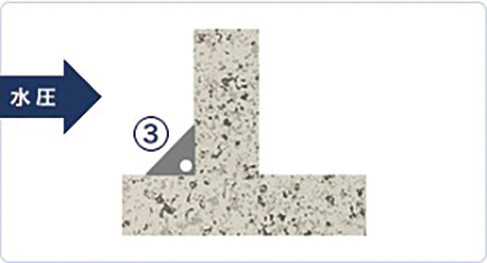 Pコン(木コン)を撤去後、本製品を充填しモルタル仕上げを行うことで、浸入水に対してゲルピタットQ改質ベントナイトが膨潤・ゲル化し、水みちを防ぎ止水する。