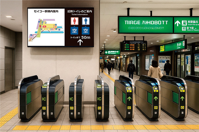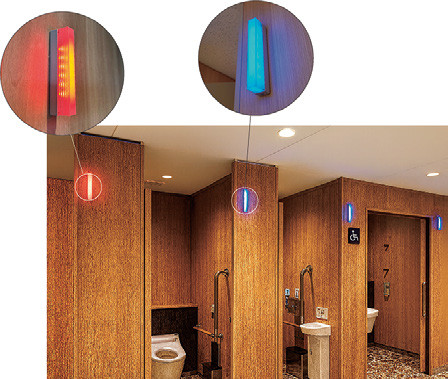 トイレ個室の使用状況をリアルタイムに検知し、空き状況をデジタルサイネージや個室前のLEDランプで可視化することができる。