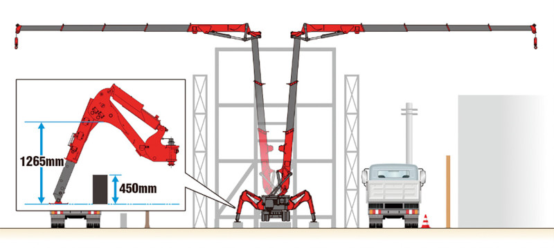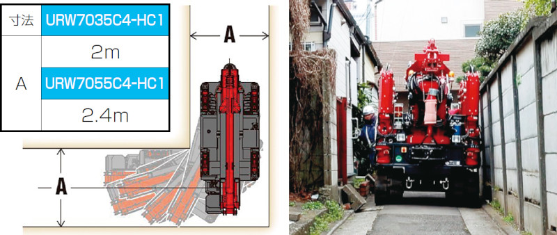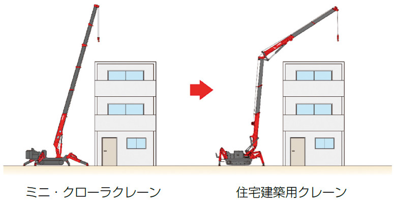 入れ子式の伸縮型(テレスコピック式)ブームの採用で、従来のミニ・クローラクレーンでは届かなかった建物の奥側へのアクセスが容易に行え、架空線や足場などをかわして資材搬入が可能となった。