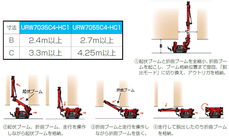 通常のクレーン・アウトリガ操作の制限を解除し、狭い隙間にクレーンを通して現場から撤収する際に必要な操作のみが行える「脱出モード」を搭載している。