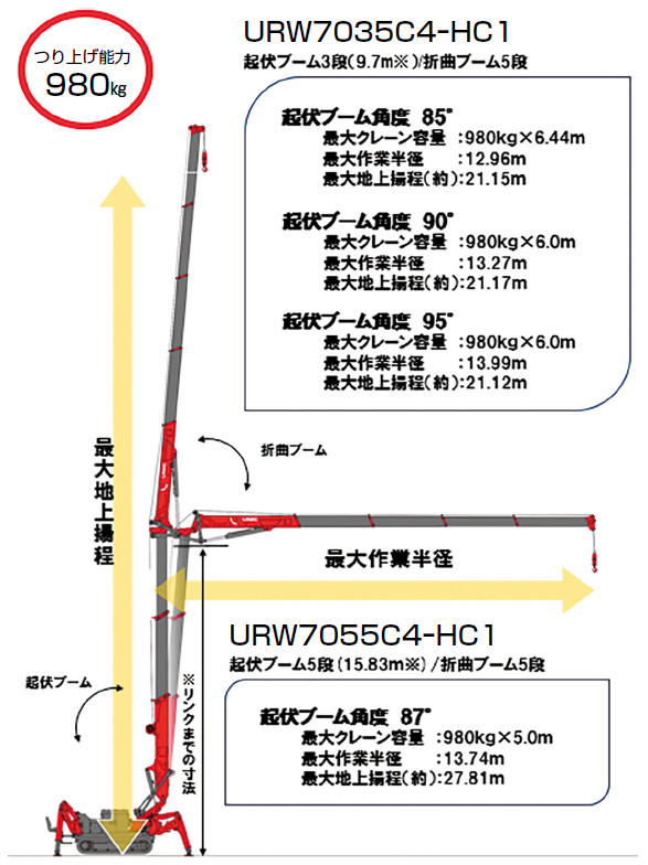 また、同社の乗車型ミニ・クローラクレーンでは初めてアウトリガに2段折曲式を採用した。