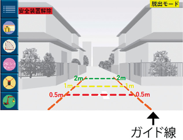 走行モードでは、クレーン本体の車幅を示すガイド線も表示されるため、狭い通路でも安全に走行可能。