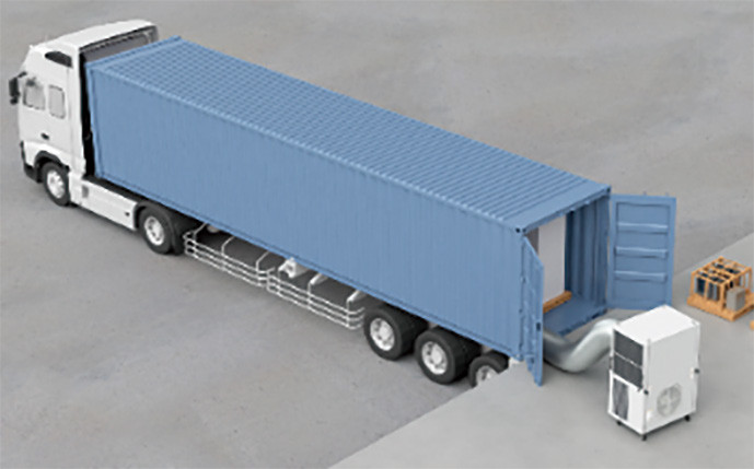 コンテナは閉鎖空間のため熱がこもりやすく、夏場は 50℃を超えることもあるが、熱がこもったコンテナの奥部へダクトを使って冷風を届けることで、安全な労働環境が作れる。