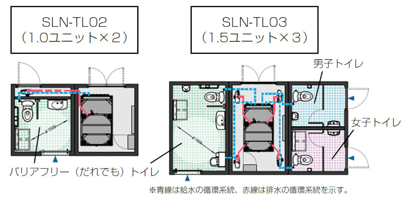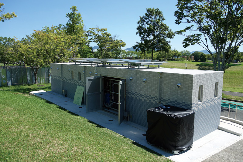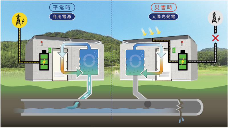 平常時は商用電源、下水に接続でき、被災時には自立循環運転に切り替えることで、防災トイレに早変わりする。