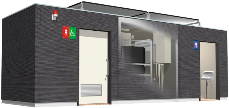 また、通常時は下水道へ直結し、上水道、商用電源を引き込み通常の公衆トイレとして利用し、災害発生時にライフラインが止まった際は、内蔵するトワイレインサイトへ手動で切り替えることで水洗式の防災トイレへと早変わりする。