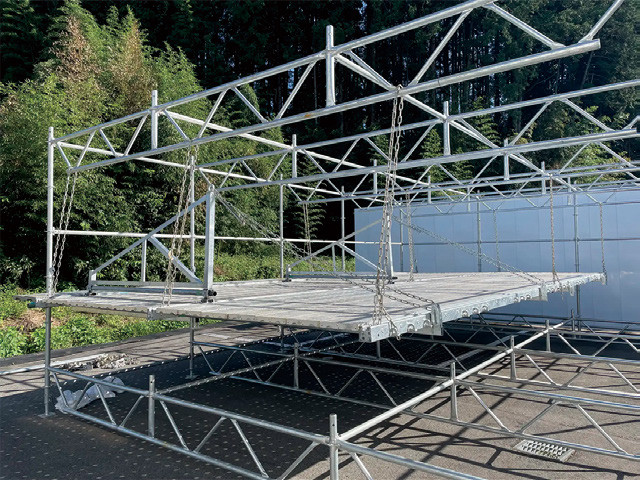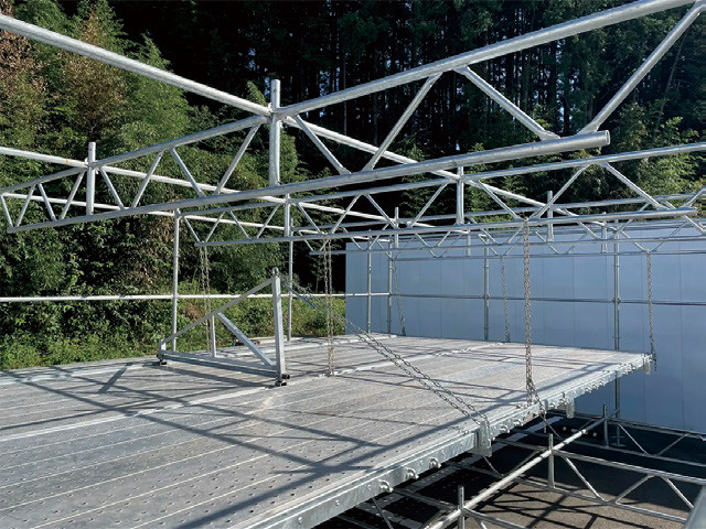 またアルミロングステージはもとより、事業者が既に所有しているアルミ足場板、杉足場板を使用することも可能である。