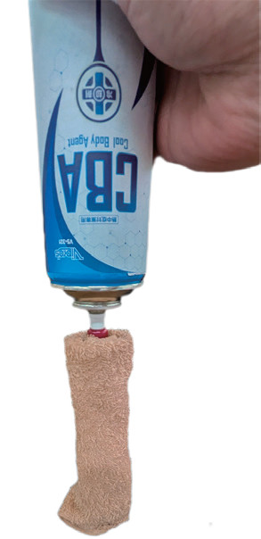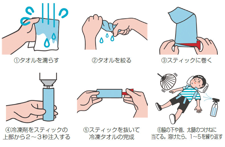 1.水で濡らしたタオルを専用スティックに巻き付け、冷却剤をスティックに2~3秒注入するだけで、冷凍庫で凍らせたタオルのようになる。